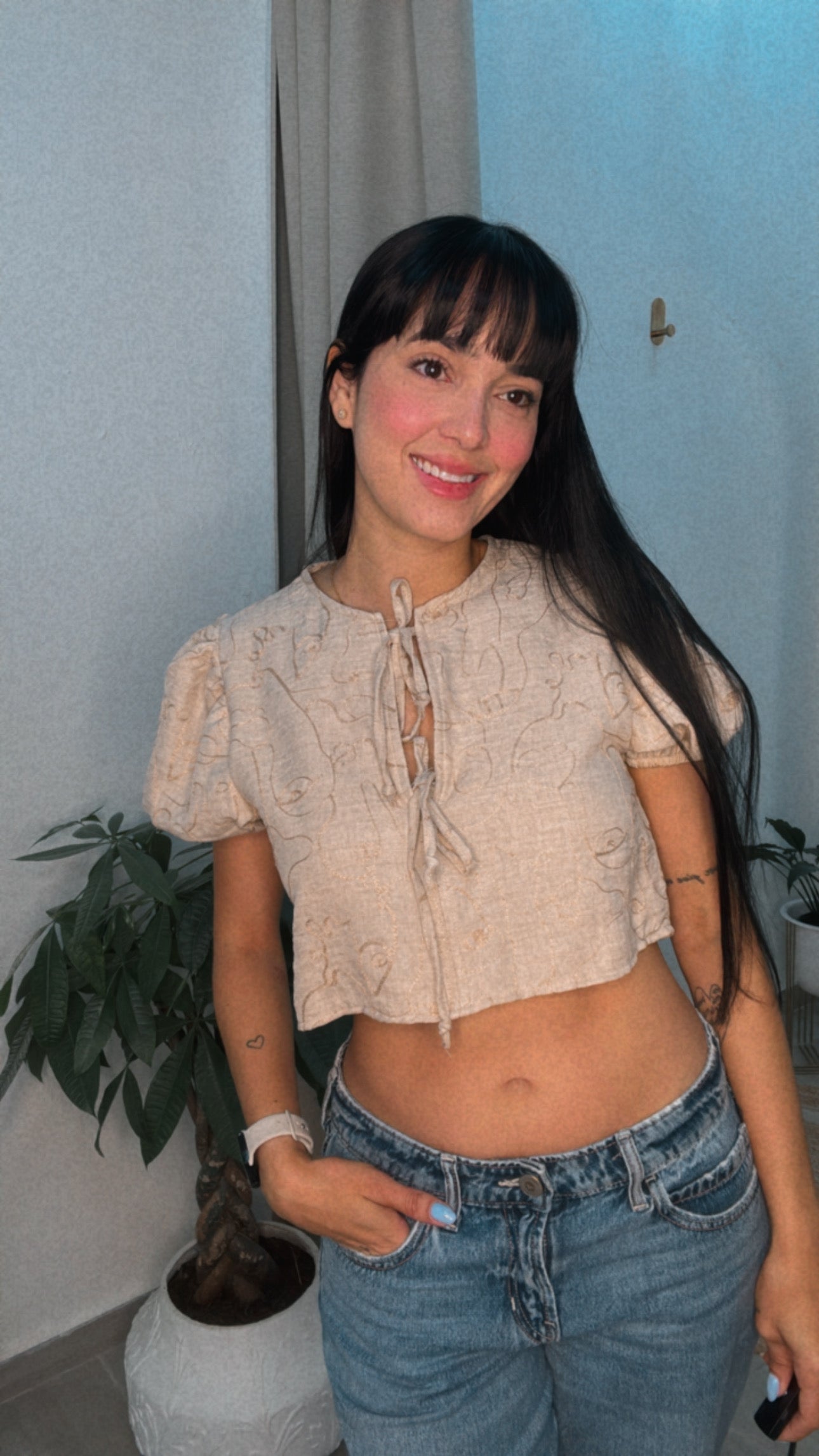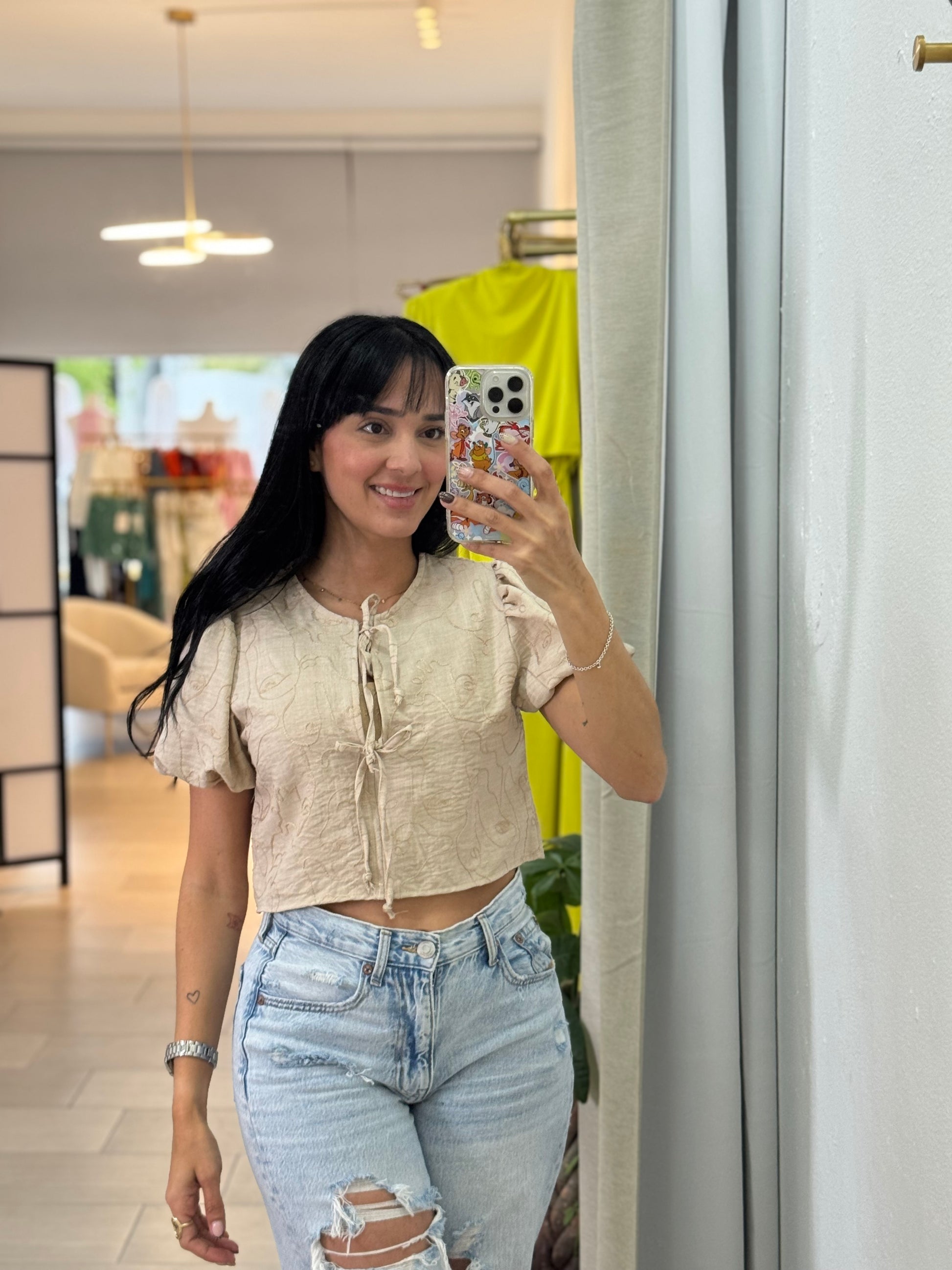 Embroidered Front Tie Blouse- Stone